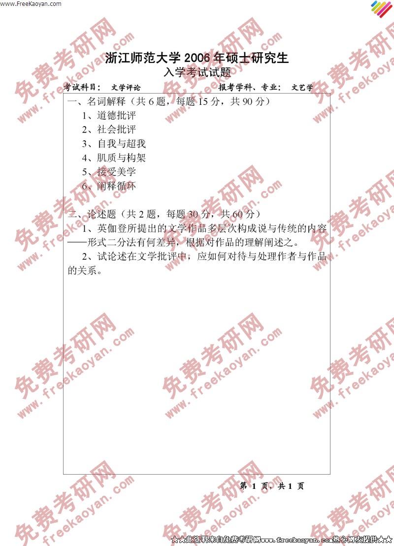 浙江师范大学2006年半岛在线注册真题-文学评论
