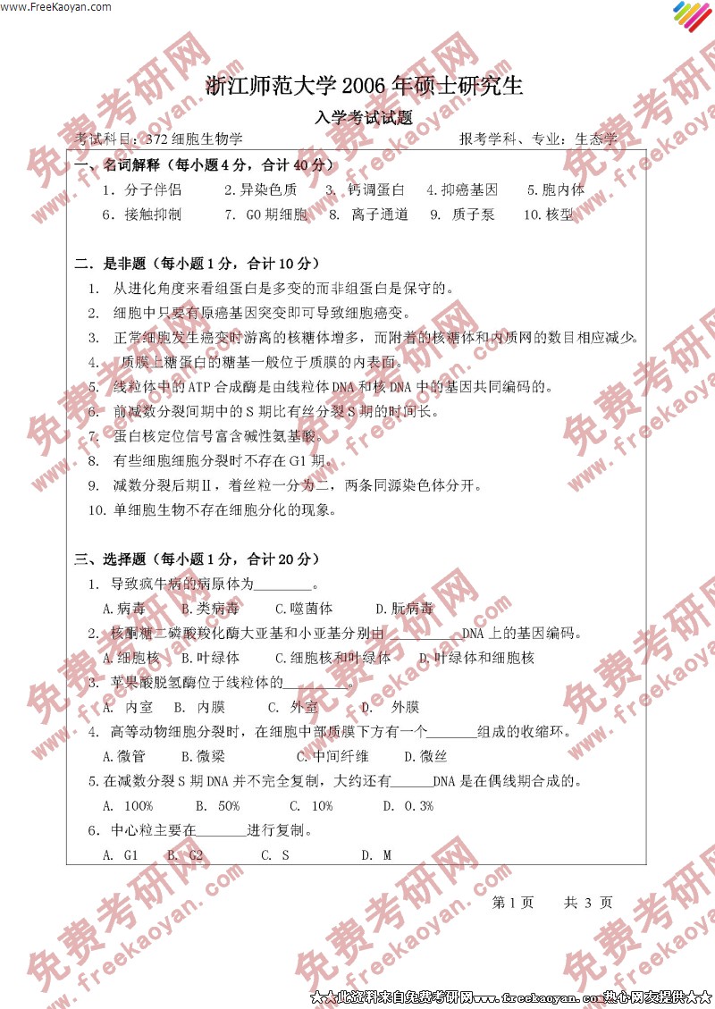浙江师范大学2006年半岛在线注册真题-细胞生物学