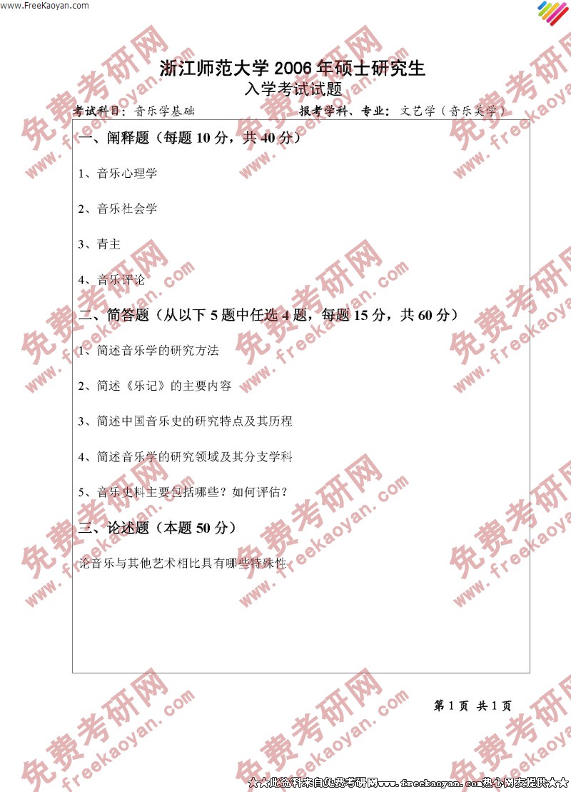 专业课半岛在线注册经验 本站小编 FreeKaoyan 2018-01-22浙江师范大学2006年半岛在线注册真题-音乐美学