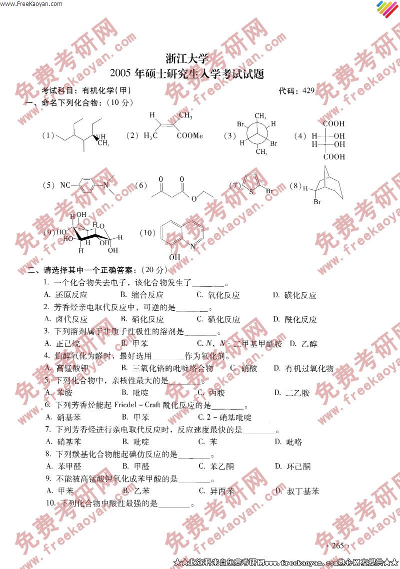 浙江大学2005年半岛在线注册真题-有机化学甲