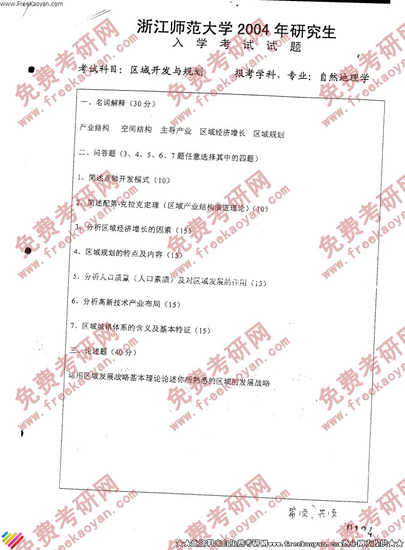 浙江师范大学2004年半岛在线注册真题-区域开发与规划