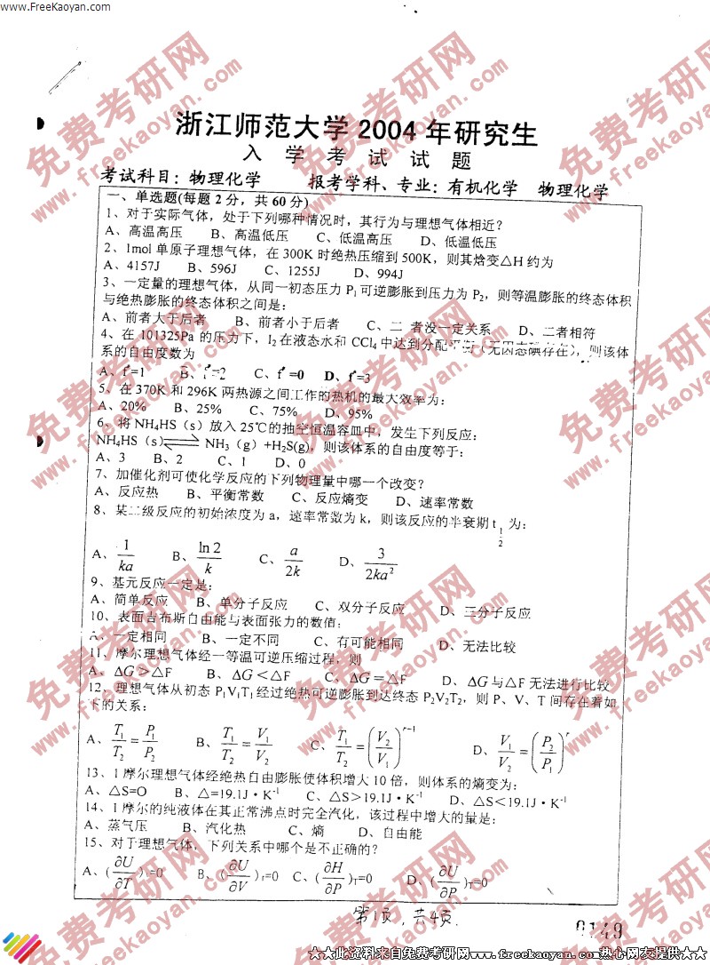 浙江师范大学2004年半岛在线注册真题-物理化学