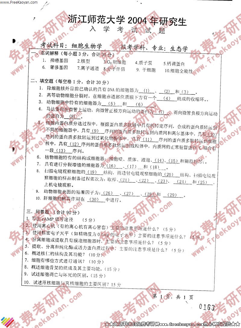 浙江师范大学2004年半岛在线注册真题-细胞生物学