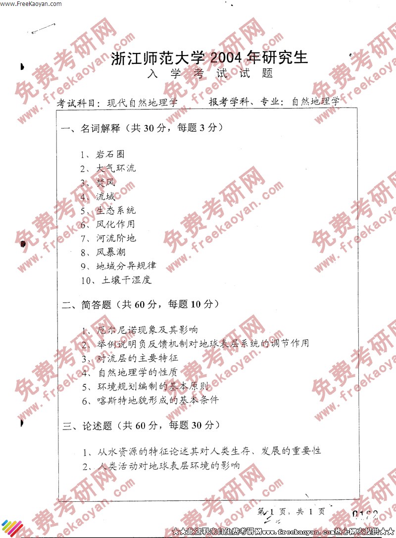 浙江师范大学2004年半岛在线注册真题-现代自然地理学