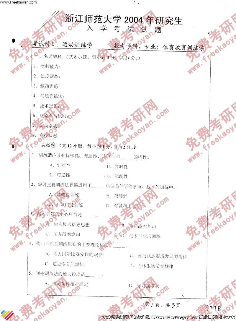 浙江师范大学2004年半岛在线注册真题-运动训练学