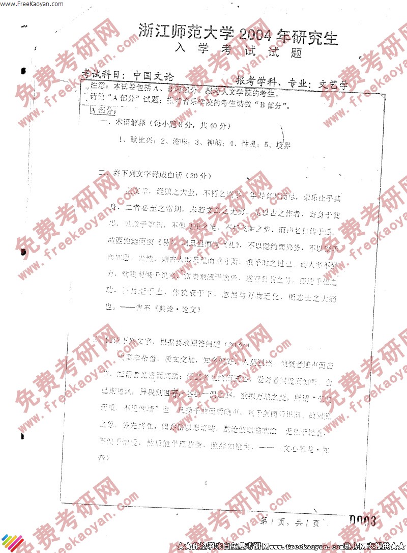 浙江师范大学2004年半岛在线注册真题-中国文论