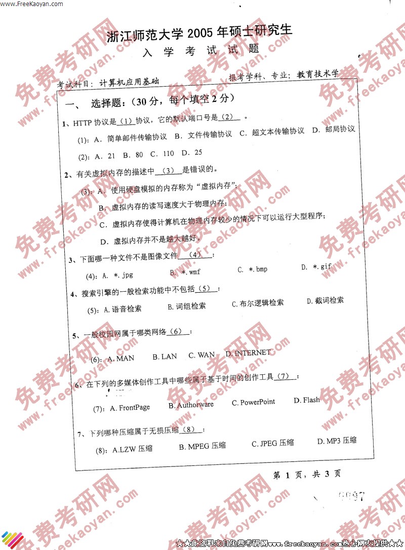 浙江师范大学2005年半岛在线注册真题-计算机应用基础