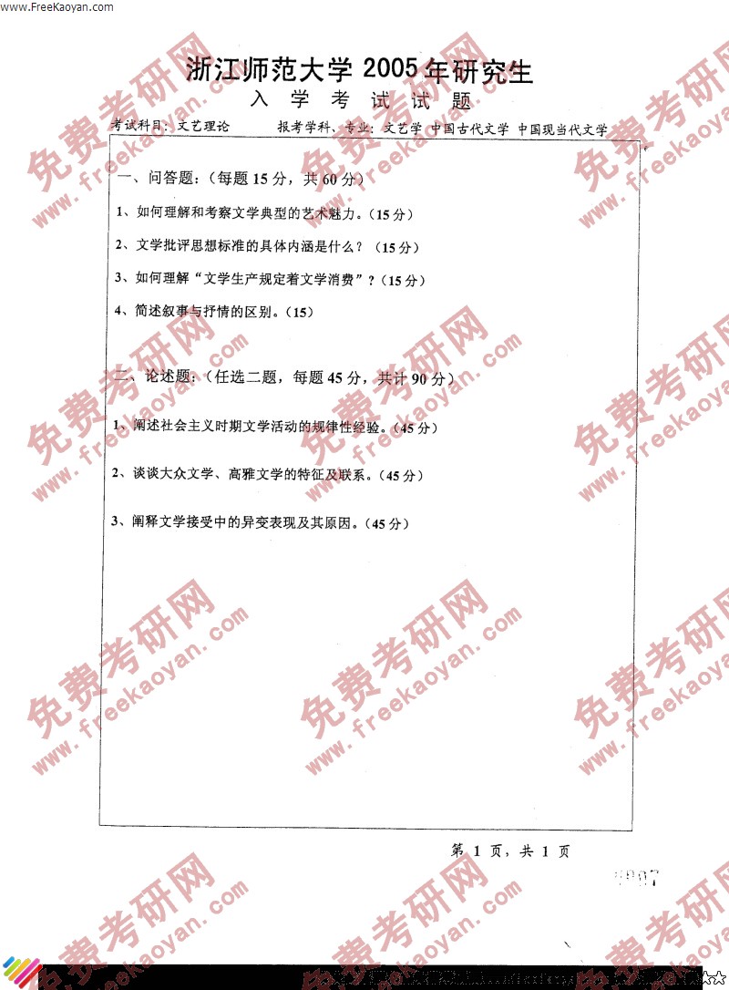 浙江师范大学2005年半岛在线注册真题-文艺理论