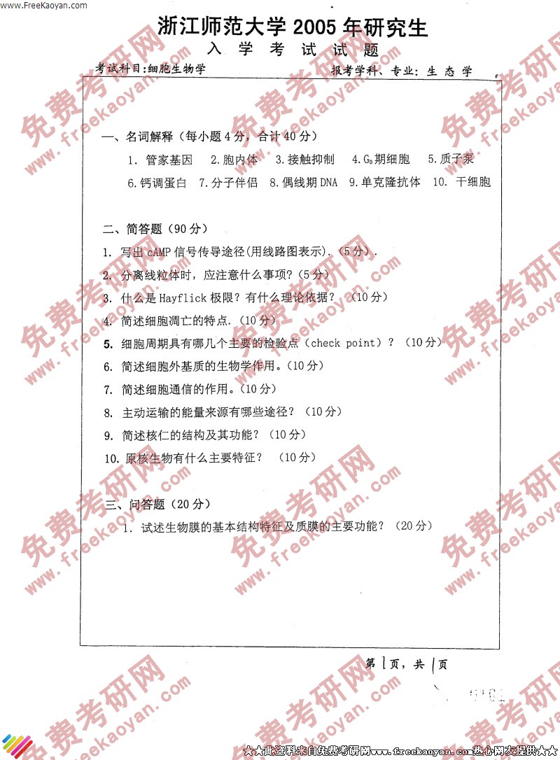 浙江师范大学2005年半岛在线注册真题-细胞生物学