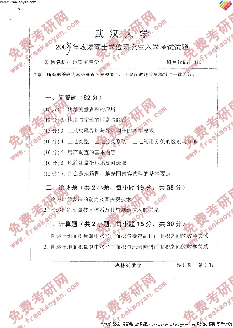 武汉大学2005年半岛在线注册真题-地籍测量学