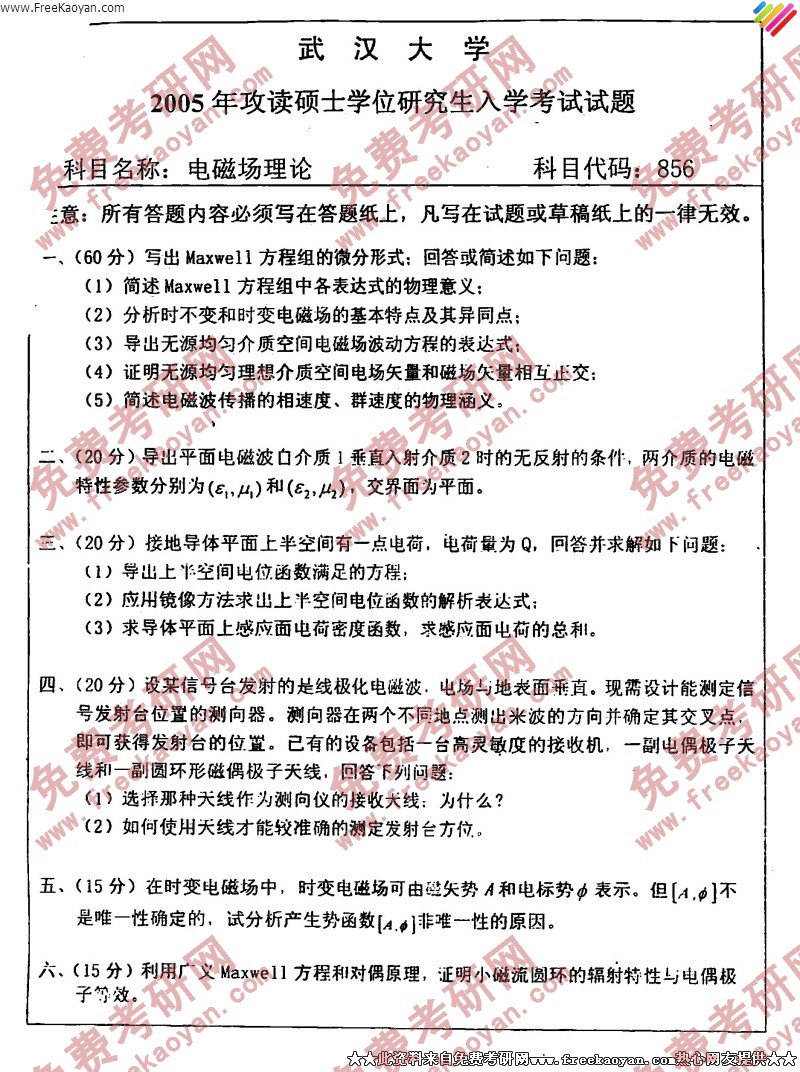武汉大学2005年半岛在线注册真题-电磁场理论