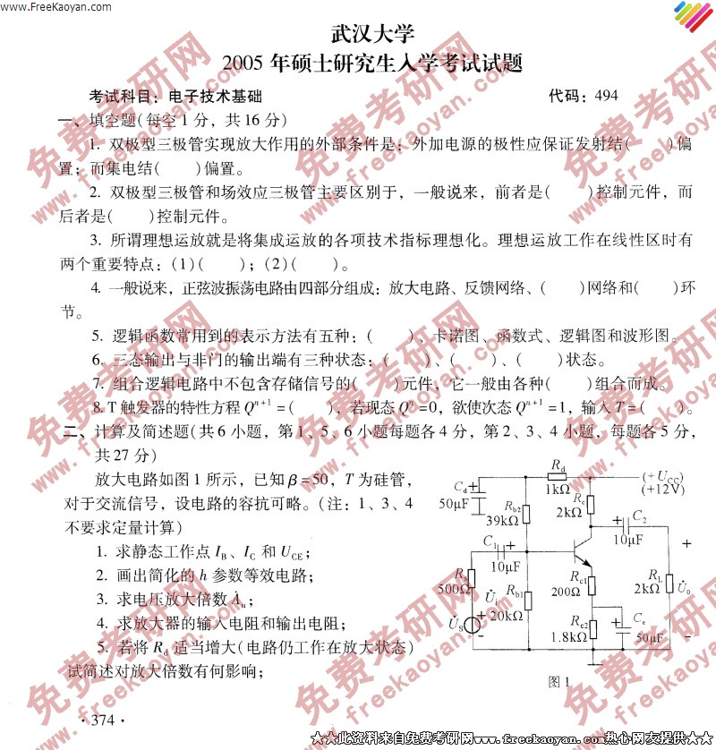 武汉大学2005年半岛在线注册真题-电子技术基础