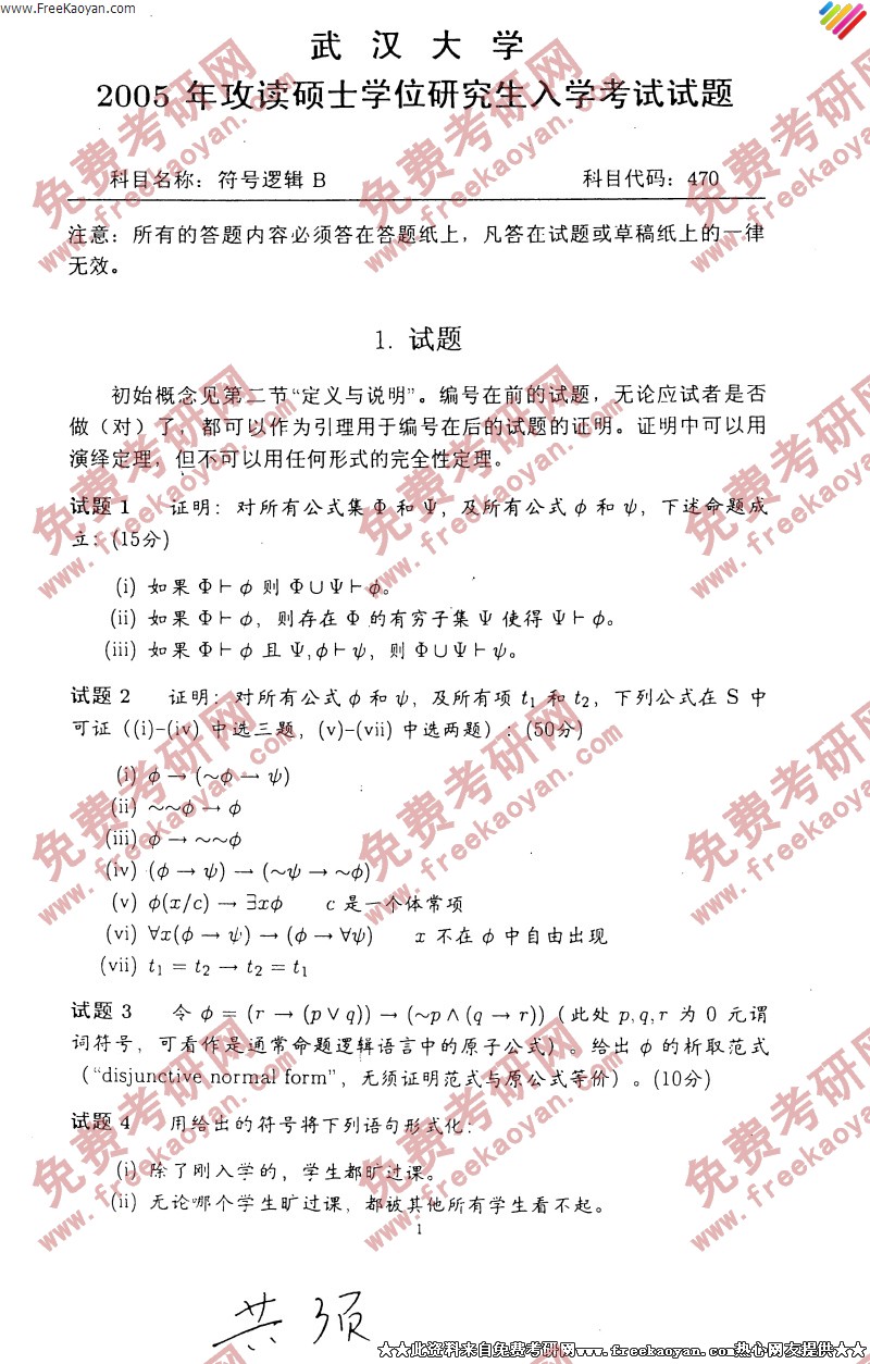 武汉大学2005年半岛在线注册真题-符号逻辑B