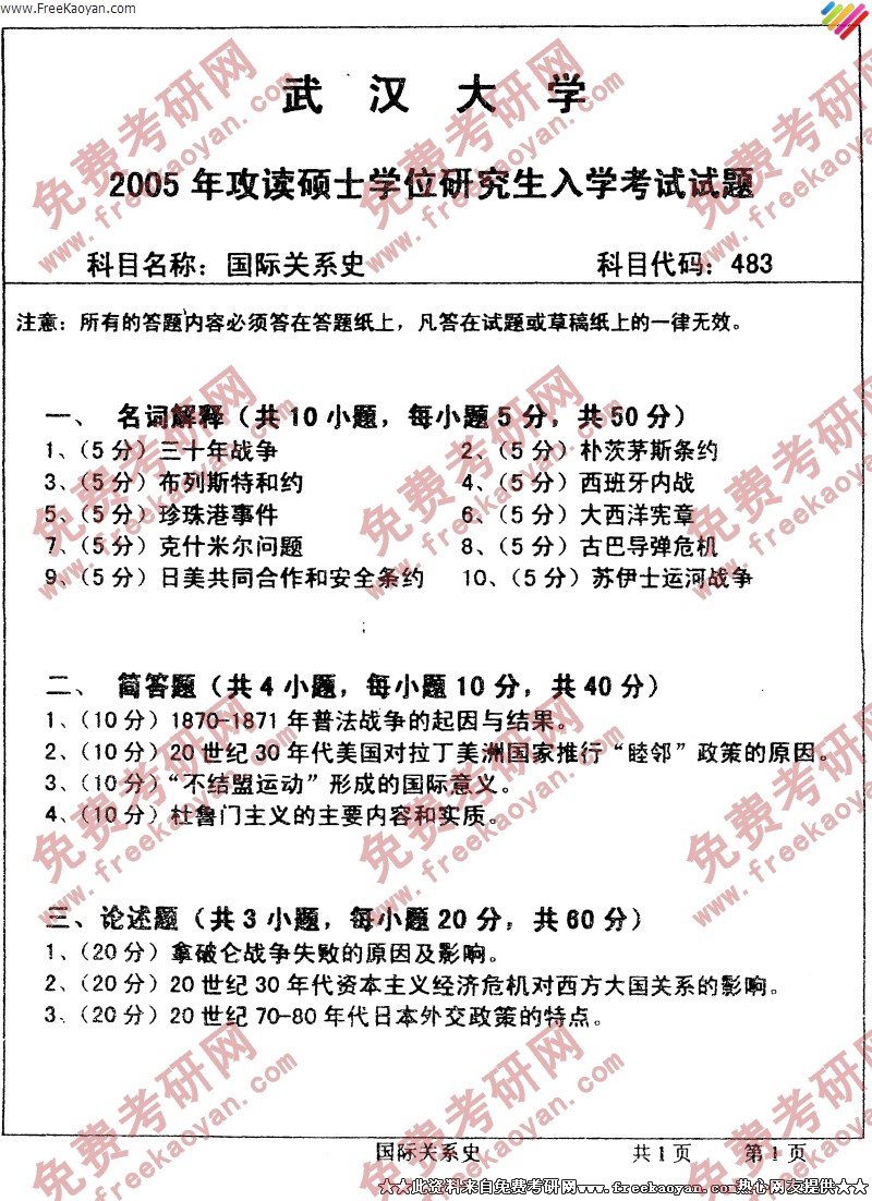 专业课半岛在线注册经验 本站小编 FreeKaoyan 2018-01-22武汉大学2005年半岛在线注册真题-国际法与国际关系史