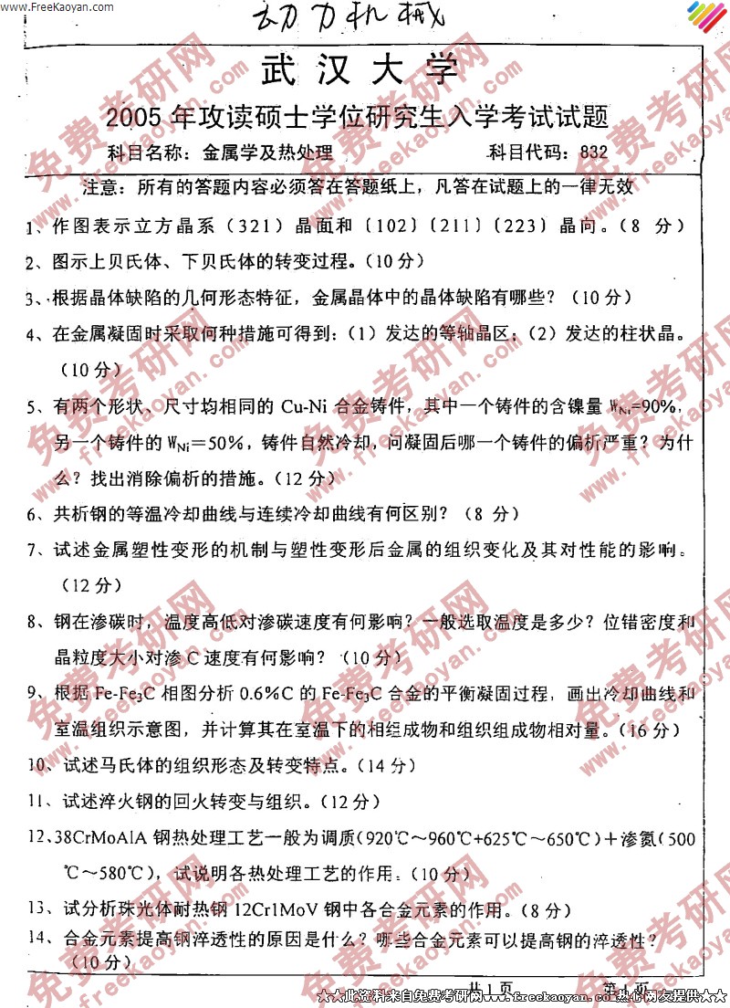 武汉大学2005年半岛在线注册真题-金属及热处理