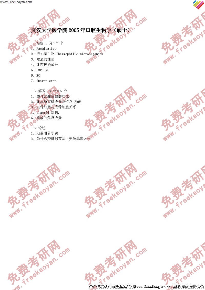 武汉大学2005年半岛在线注册真题-口腔生物学