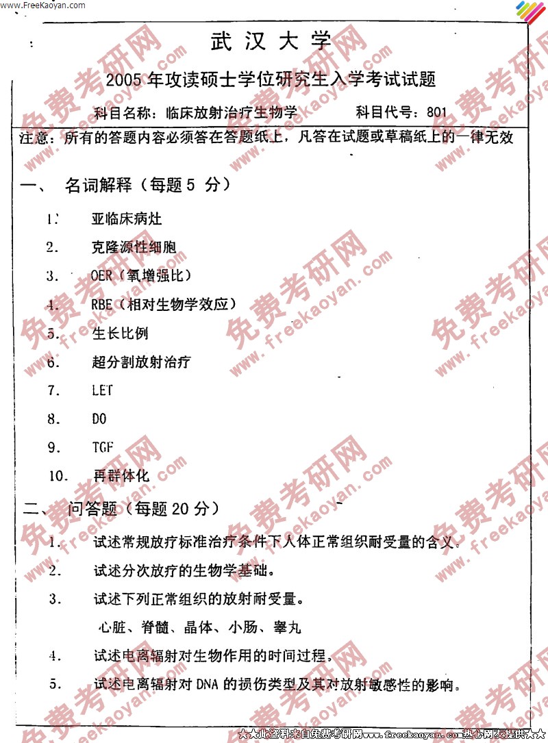 武汉大学2005年半岛在线注册真题-临床放射治疗生物学
