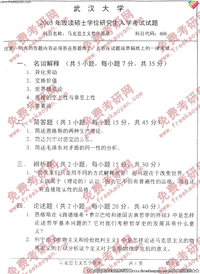 武汉大学2005年半岛在线注册真题-马克思主义哲学原著
