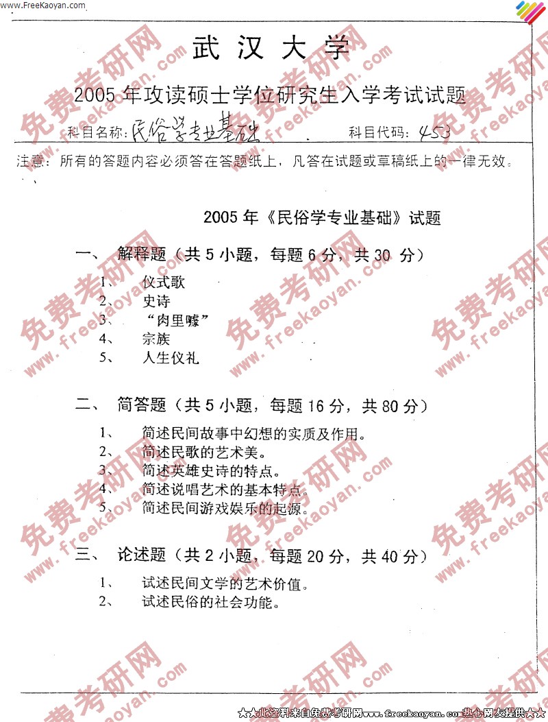 武汉大学2005年半岛在线注册真题-民俗学基础