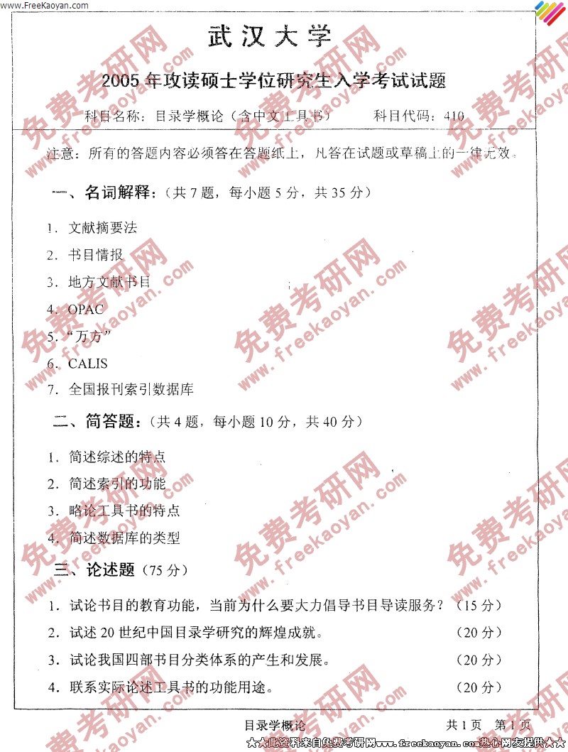 武汉大学2005年半岛在线注册真题-目录学概论