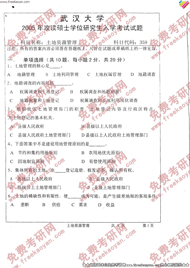 武汉大学2005年半岛在线注册真题-土地资源管理