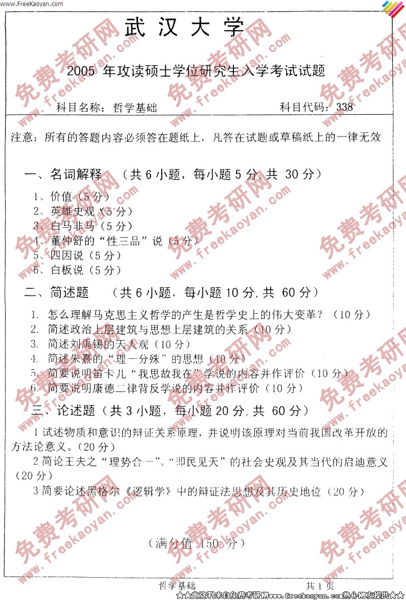 专业课半岛在线注册经验 本站小编 FreeKaoyan 2018-01-22武汉大学2005年半岛在线注册真题-西方哲学史与现代西方哲学