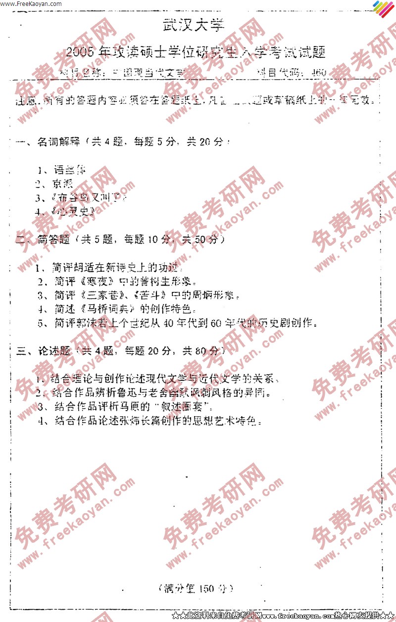 武汉大学2005年半岛在线注册真题-中国现当代文学