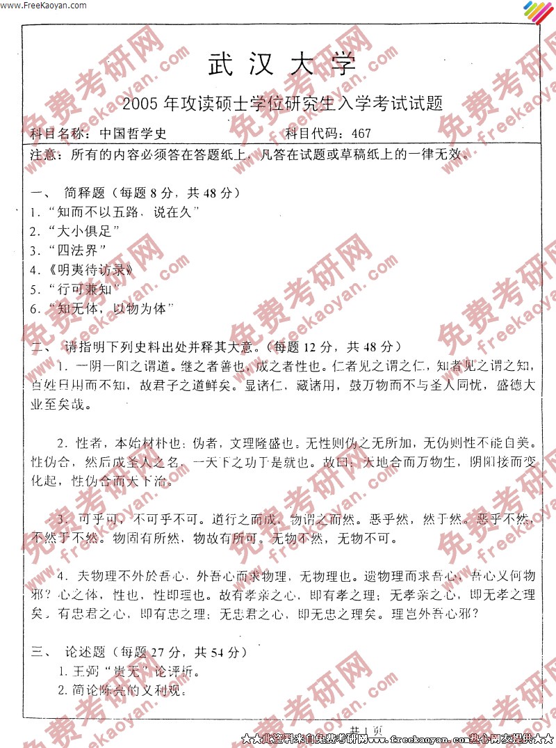 武汉大学2005年半岛在线注册真题-中国哲学史