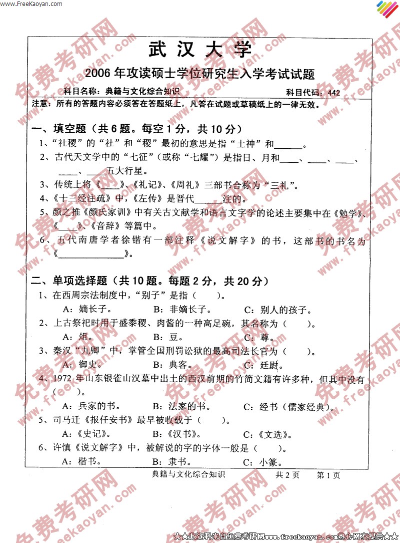 武汉大学2006年半岛在线注册真题-典籍与文化综合知识