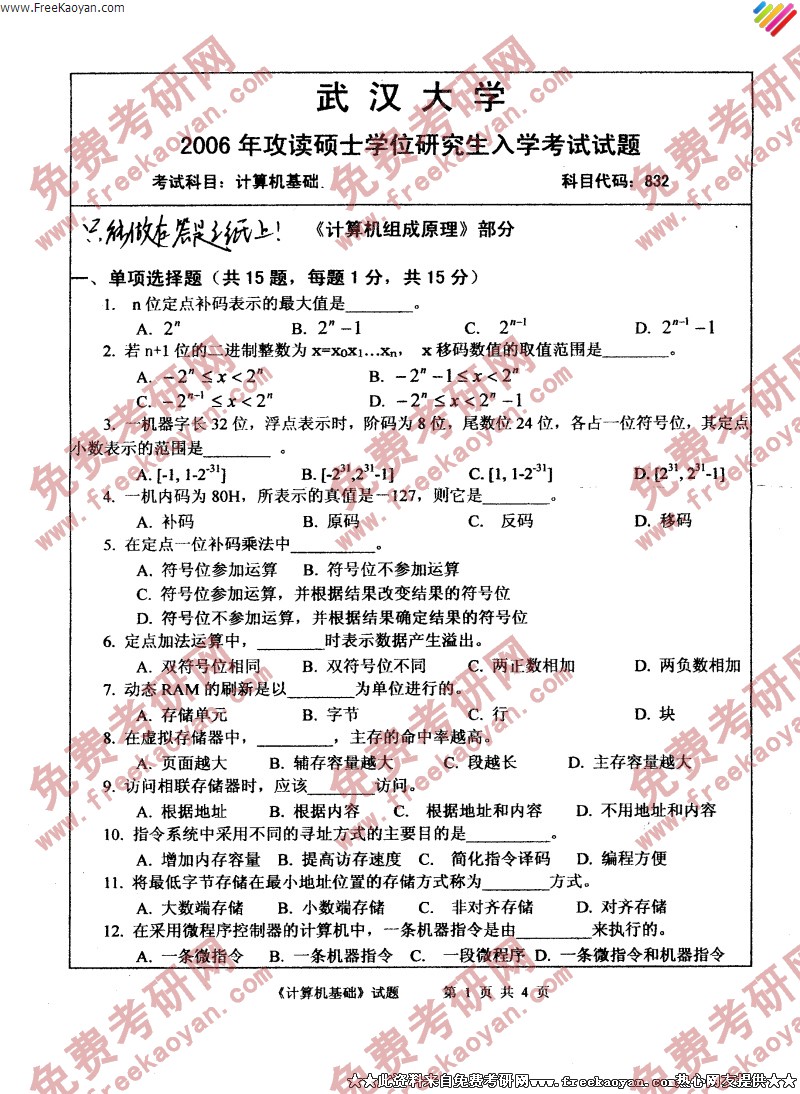 专业课半岛在线注册经验 本站小编 FreeKaoyan 2018-01-22武汉大学2005年半岛在线注册真题-综合知识(A、B)