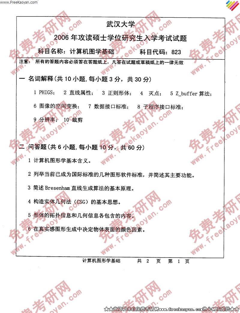 武汉大学2006年半岛在线注册真题-计算机图学基础