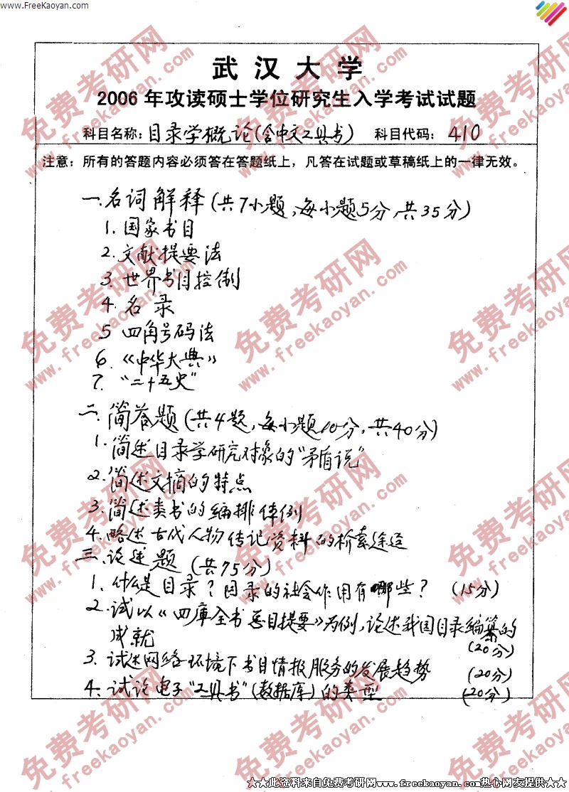 武汉大学2006年半岛在线注册真题-目录学概论(含中文工具书)
