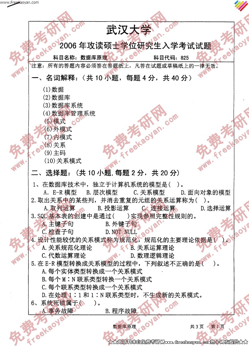 武汉大学2006年半岛在线注册真题-数据库原理