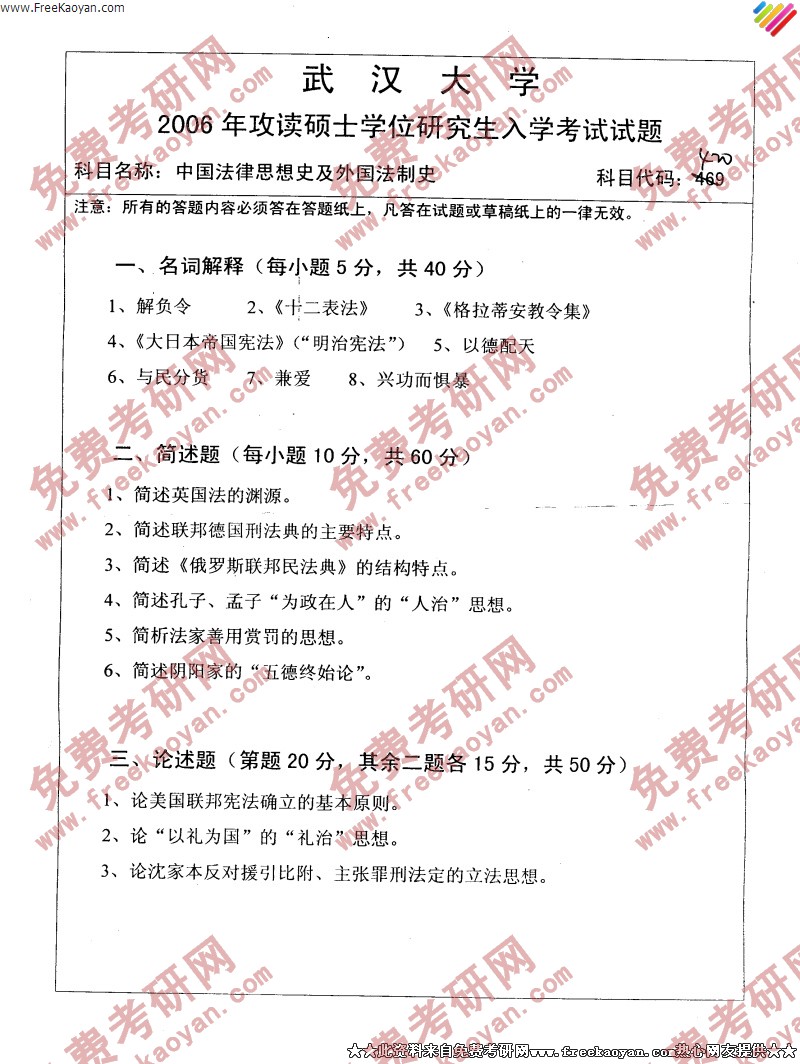 武汉大学2006年半岛在线注册真题-中国法律思想史及外国法制史