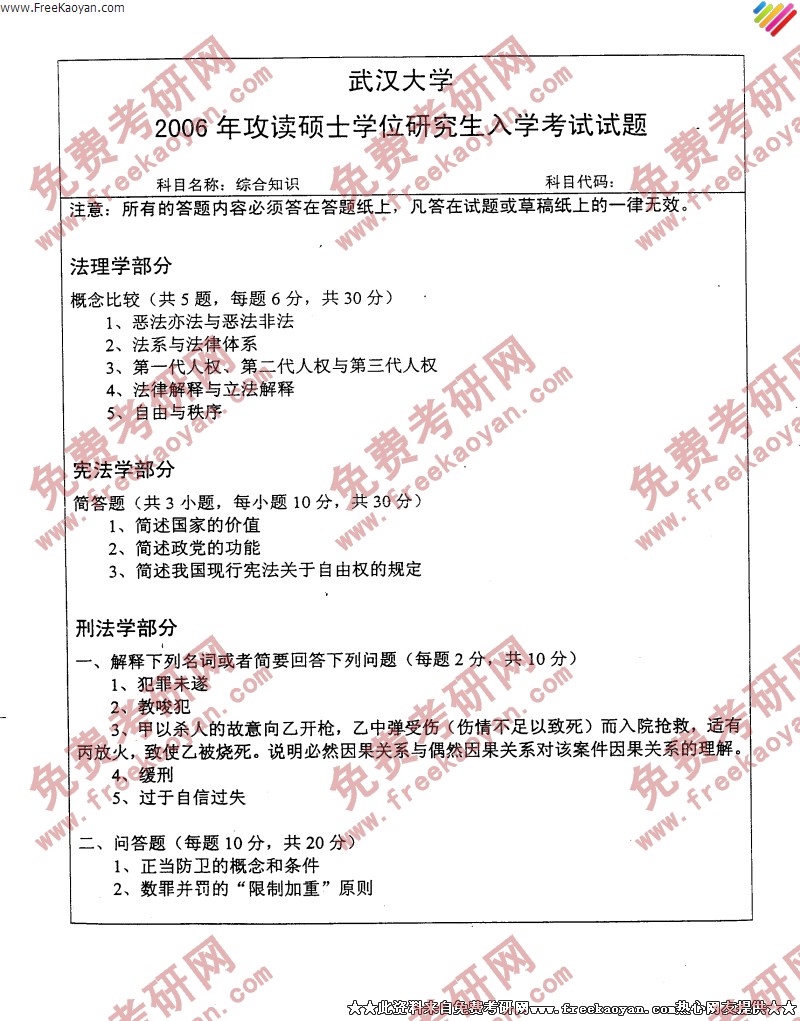 专业课半岛在线注册经验 本站小编 FreeKaoyan 2018-01-22武汉大学2006年半岛在线注册真题-综合知识(含法理学、宪法学、民法学、刑法学、国际法)
