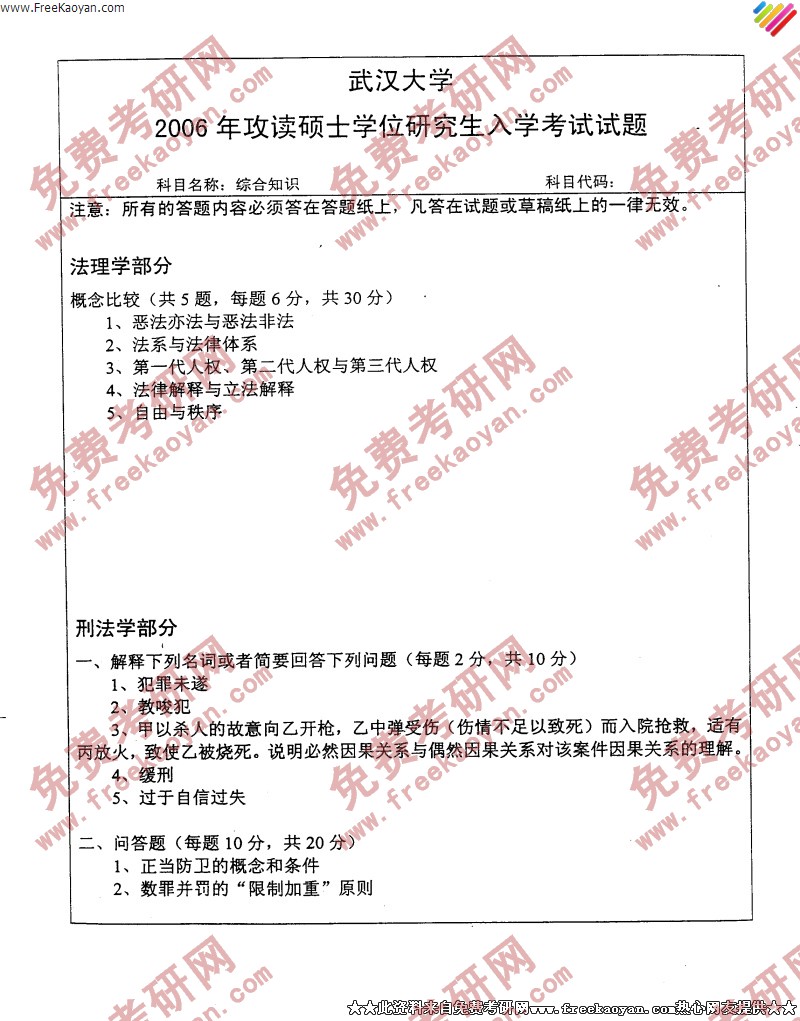 专业课半岛在线注册经验 本站小编 FreeKaoyan 2018-01-22武汉大学2006年半岛在线注册真题-综合知识(含法理学、宪法学、刑法学、行政法、国际法)
