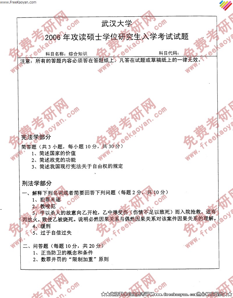 专业课半岛在线注册经验 本站小编 FreeKaoyan 2018-01-22武汉大学2006年半岛在线注册真题-综合知识(含法理学、宪法学、刑法学、民法学、行政法)