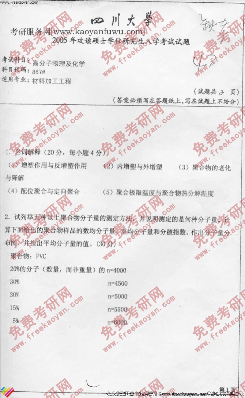 专业课半岛在线注册经验 本站小编 FreeKaoyan 2018-01-22四川大学2005年半岛在线注册真题-高分子化学及物理学