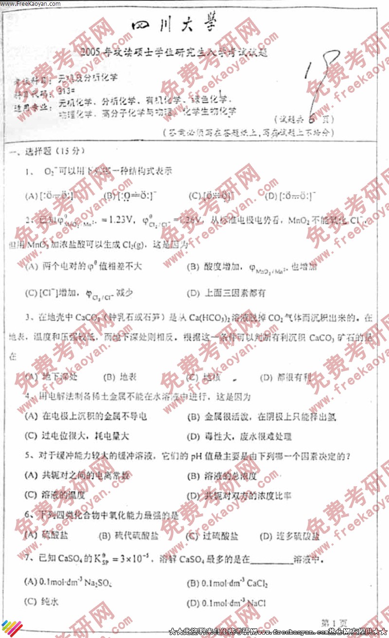 专业课半岛在线注册经验 本站小编 FreeKaoyan 2018-01-22四川大学2005年半岛在线注册真题-无机化学基础