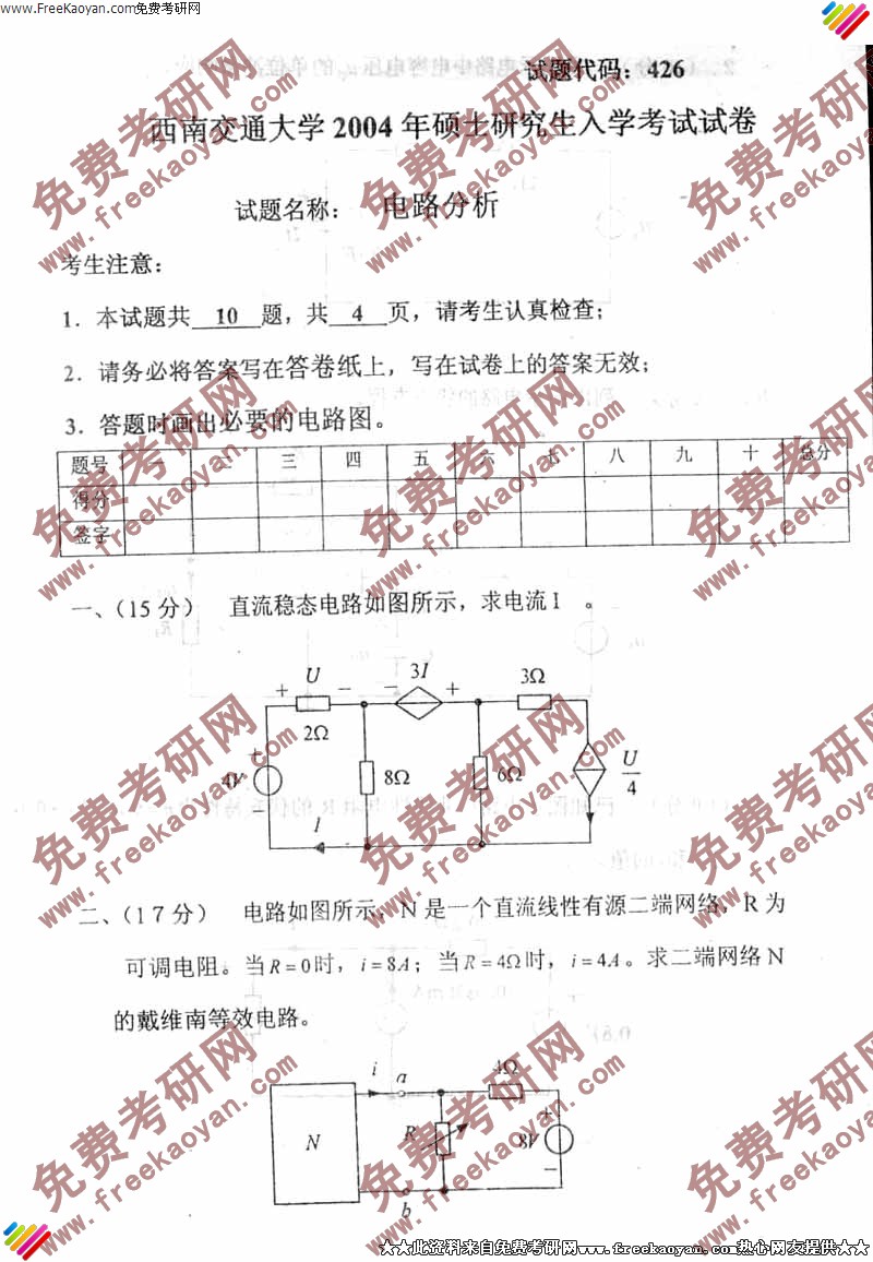 西南交通大学2004年半岛在线注册真题-电路分析试题
