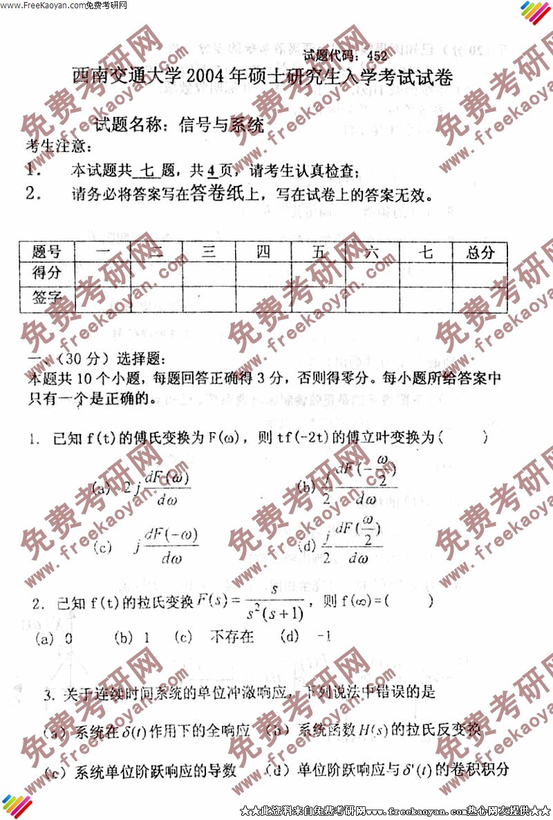 西南交通大学2004年半岛在线注册真题-信号与系统试题