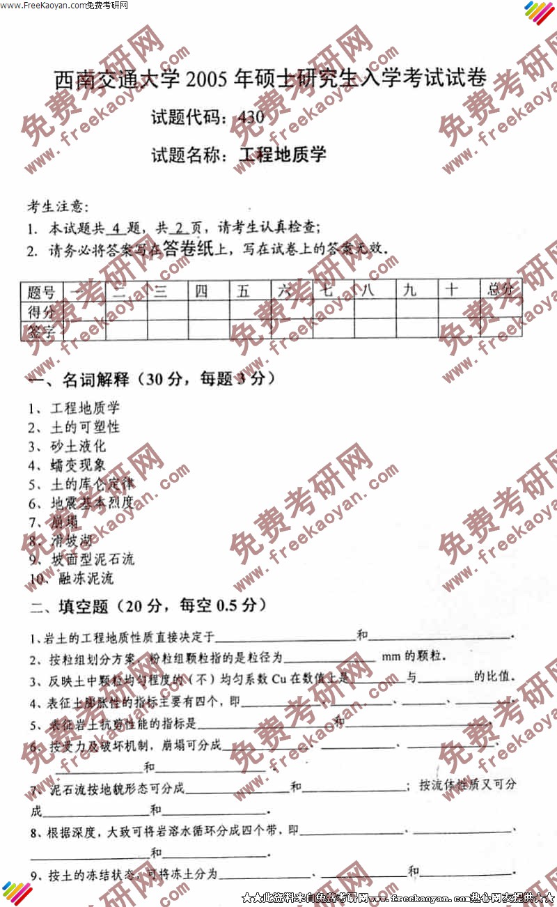 西南交通大学2005年半岛在线注册真题-工程地质学试题