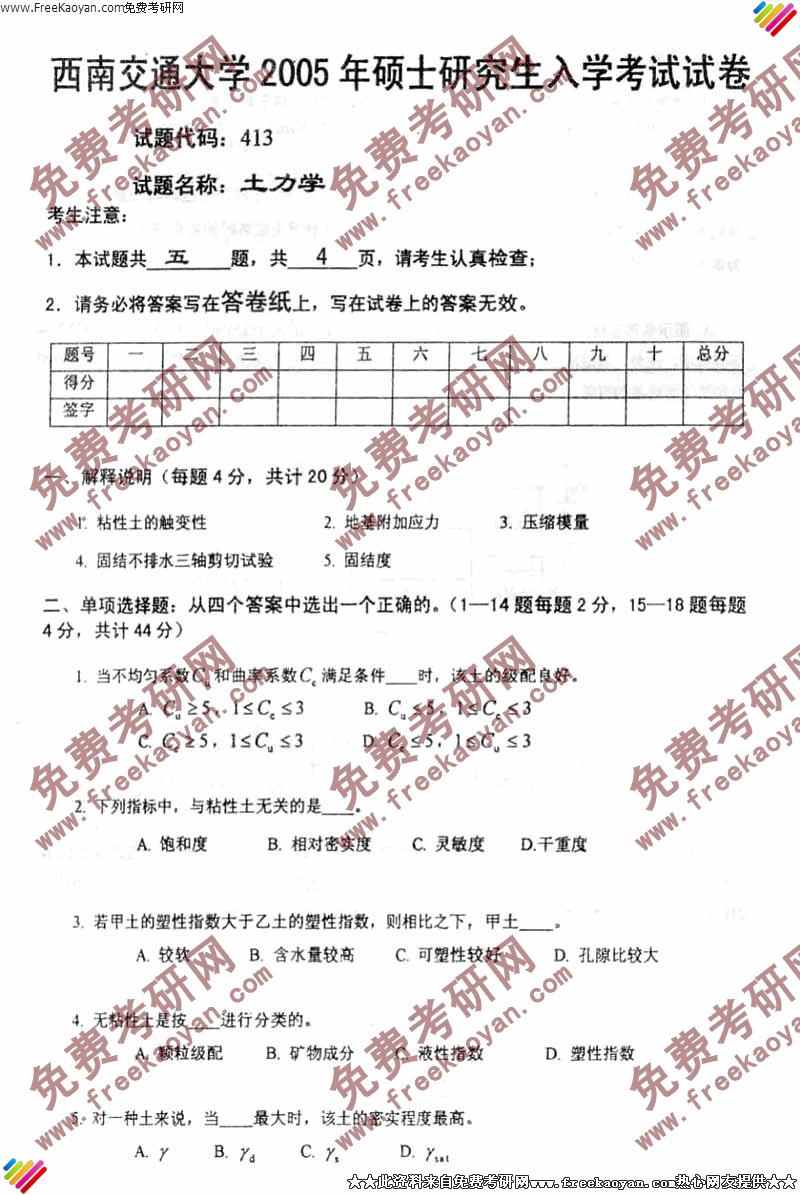 西南交通大学2005年半岛在线注册真题-土力学试题