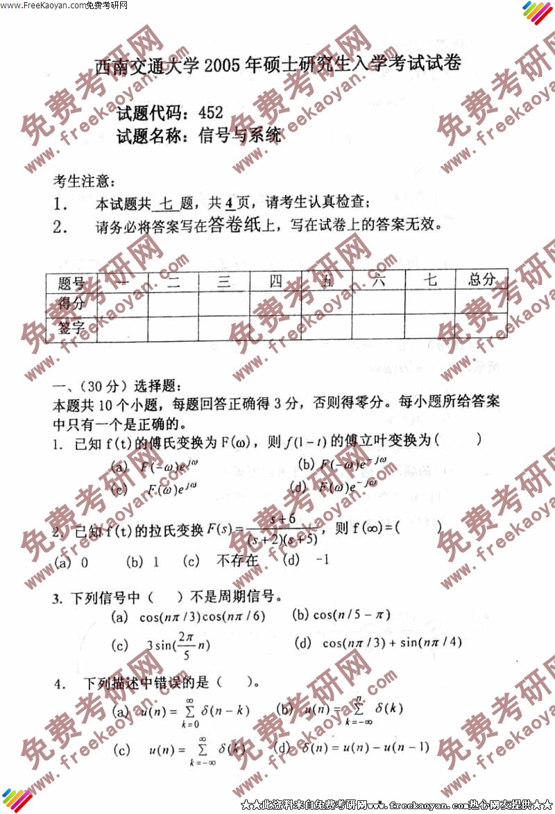 西南交通大学2005年半岛在线注册真题-信号与系统试题