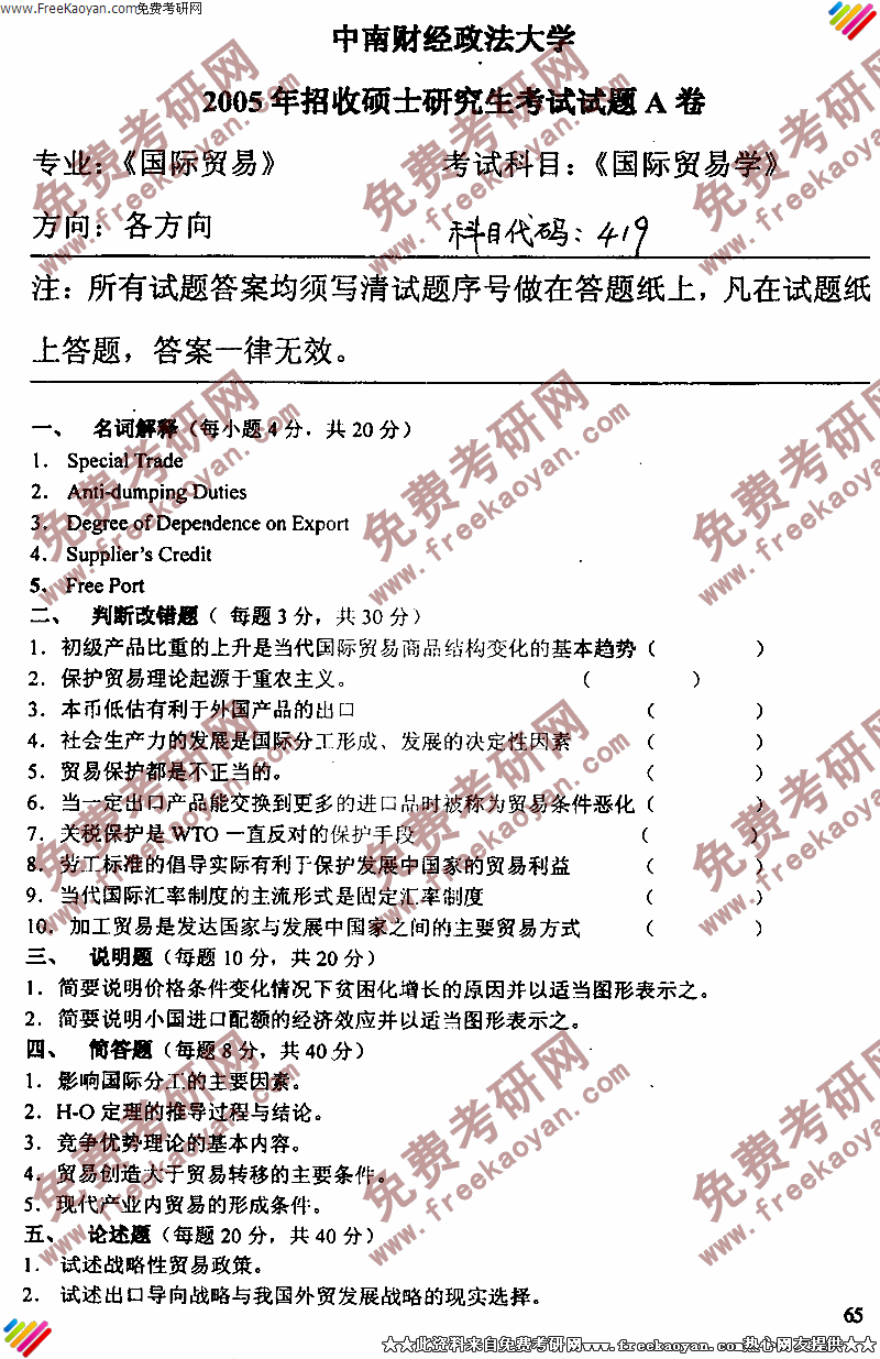 名词解释(5*6): 全部要素生产率,负投资,货币中性,准租金, 边际转换率 ,公共产品的非竞争性 简答(10*4): 比较各种市场的资源配置效率 分析信息不完全对资源配置的影响 推导总需求曲线并说明其含义 在汇率和利率由市场供求自发形成的情况下,分析资本外流所造成的影响 计算(10*2) 1 给出 ...