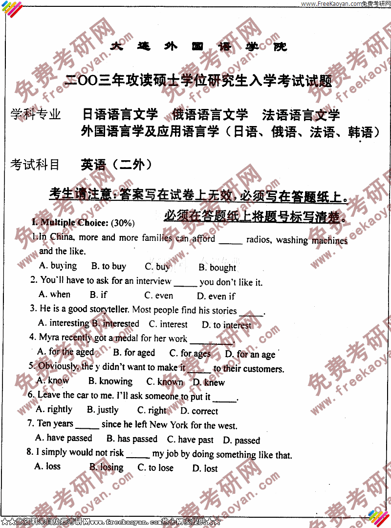 大连外国语大学2003年半岛在线注册真题-二外英语