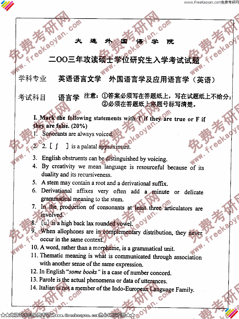 大连外国语大学2003年半岛在线注册真题-英语语言学