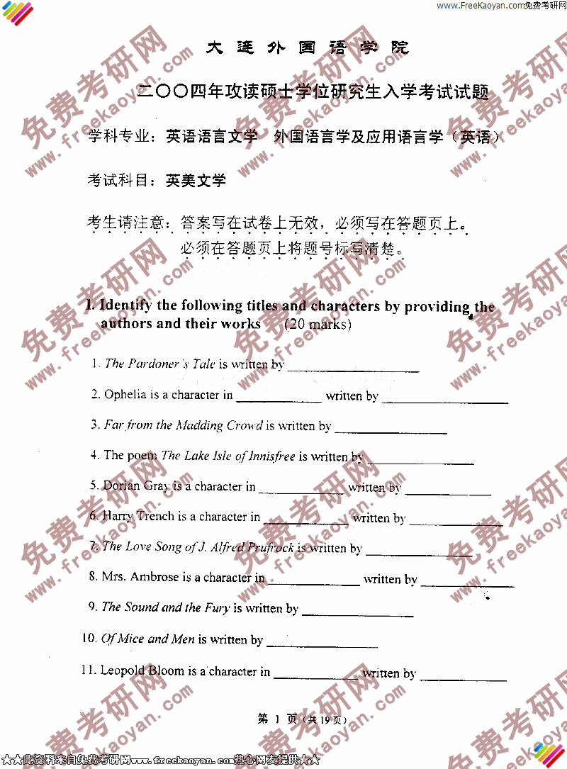 大连外国语大学2004年半岛在线注册真题-英美文学