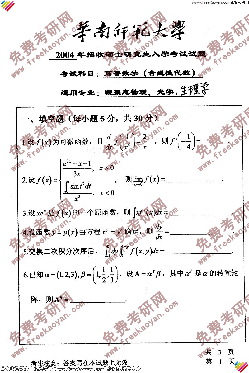 华南师范大学2004年半岛在线注册真题-高等数学(含线性代数)