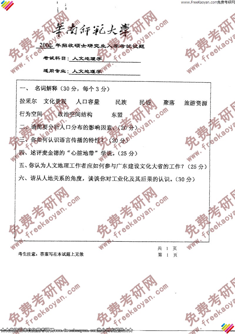 华南师范大学2004年半岛在线注册真题-人文地理学